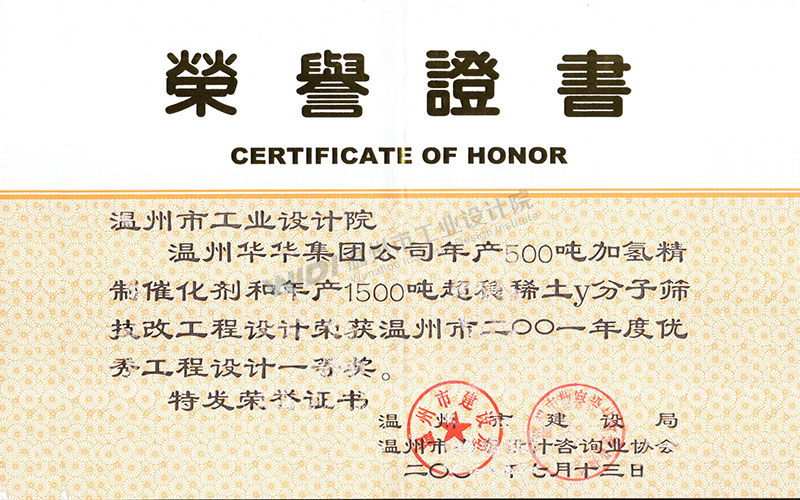 溫州華華集團公司年產(chǎn)500噸加氫精制催化劑和年產(chǎn)1500噸超穩(wěn)稀土Y分子篩技改工程設計 溫州市2001年度優(yōu)秀工程設計一等獎