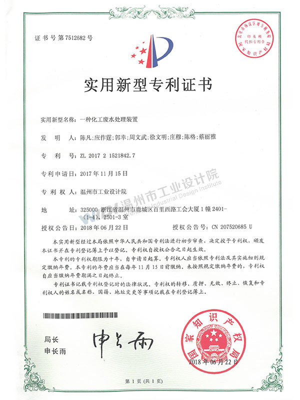 一種化工廢水處理裝置證書(shū)