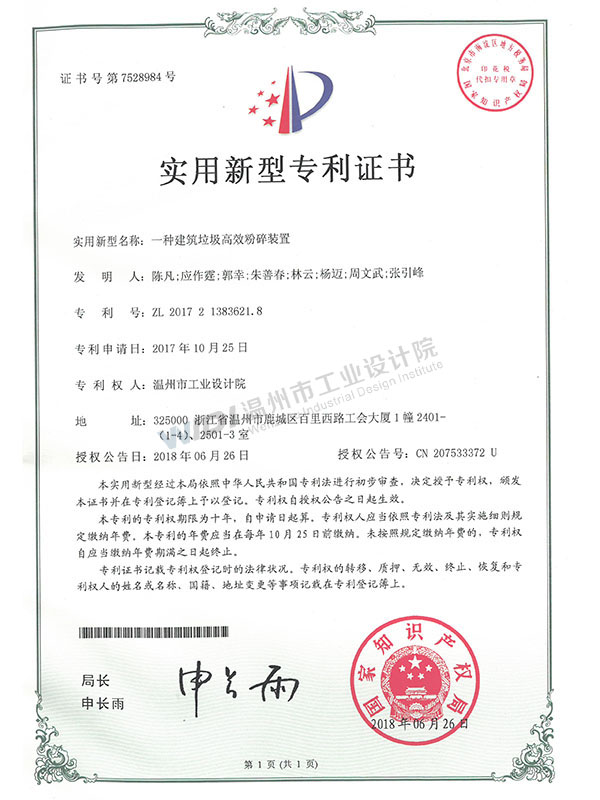 一種建筑垃圾高效粉碎裝置證書(shū)
