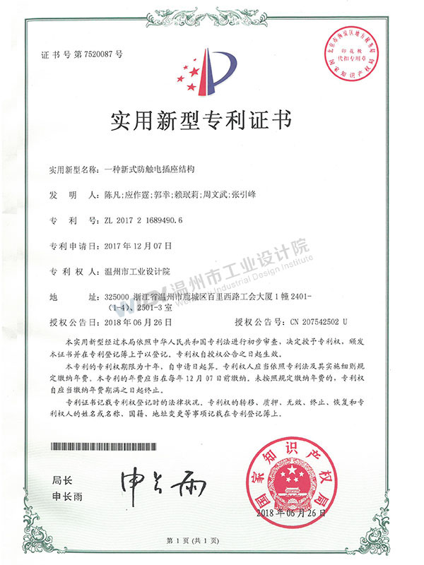 一種新式防觸電插座結(jié)構(gòu)證書(shū)